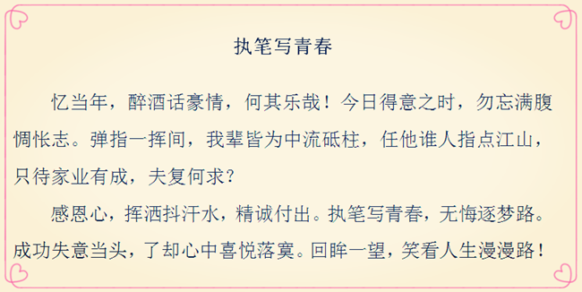 “現在,青春是用來奮斗的;將來,青春是用來回憶的。”當所有的經歷化作記憶,那些年少時為理想揮灑的汗水,為成功付出的艱辛,終將成為彌足珍貴的人生財富。