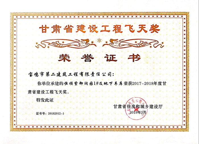 2017-2018年度甘肅省建設(shè)工程飛天獎(jiǎng)(恒順紫御潤園1#及地下車庫)