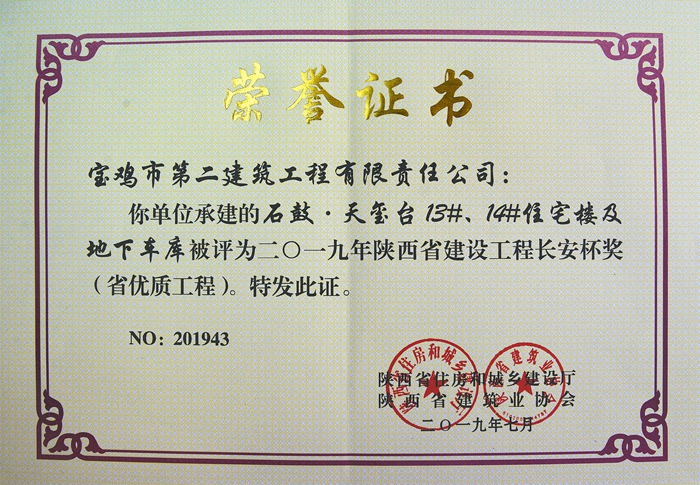 2019年陜西省建設(shè)工程長安杯獎(jiǎng)(石鼓?天璽臺(tái)13#、14#住宅樓及地下車庫)