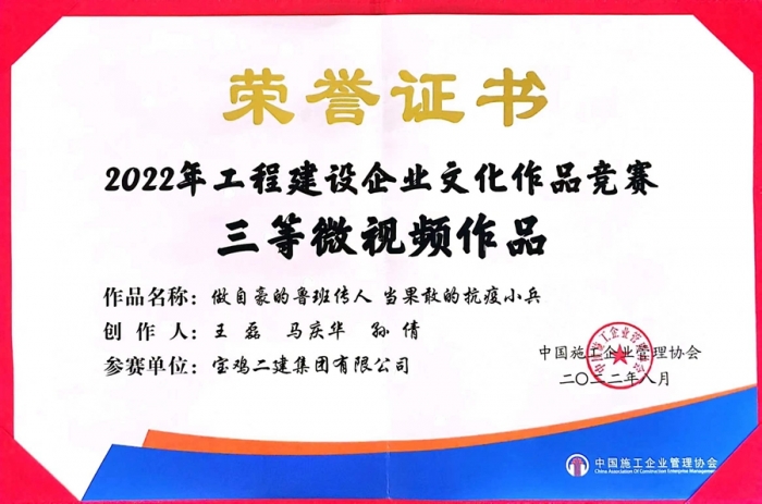 在喜迎二十大之際,中國施工企業(yè)管理協(xié)會(huì)在南寧隆重召開2022年度工程建設(shè)企業(yè)文化成果交流會(huì),會(huì)議公布了2022年度工程建設(shè)企業(yè)文化作品競賽評選結(jié)果,并進(jìn)行表彰。寶雞二建公眾號(hào)被評為“全國工程建設(shè)行業(yè)優(yōu)秀公眾號(hào)”,企業(yè)文化作品《做自豪的魯班傳人 當(dāng)果敢的抗疫小兵》微視頻榮獲三等獎(jiǎng)。