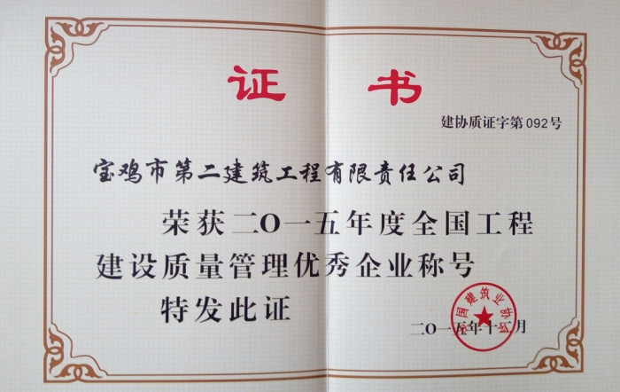 2015年度陜西省工程建設質量管理優(yōu)秀企業(yè)